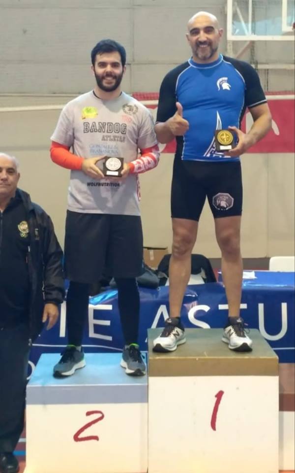 Disfrutando todavia de los tapices el presidente del Club de Lucha Esparta, Tomás Ramos, oro en menos de 100 kg...