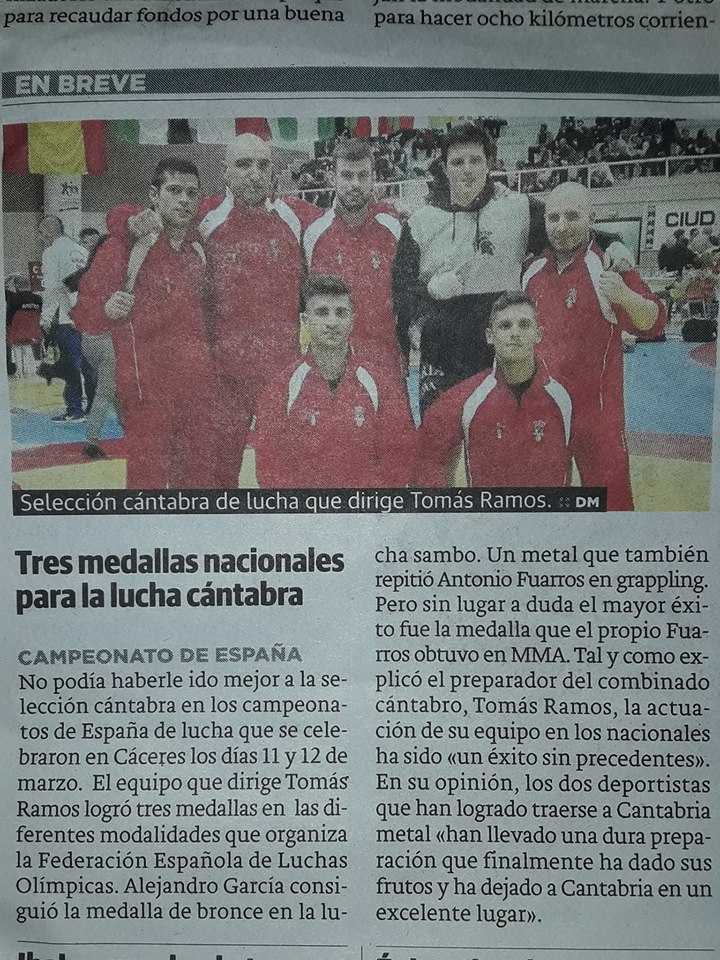 No es costumbre encontrarnos noticias sobre medallas o torneos de deportes de contacto en la prensa nacional, pero todo cambia cuando el Club de lucha Esparta, en nombre de la selección cántabra de lucha, se trae consigo tres medallas en diferentes disciplinas de lucha. Gracias al Diario Montañés por brindarnos un hueco en uno de los periódicos más importantes de la región.